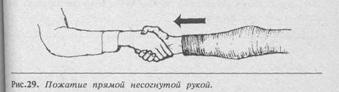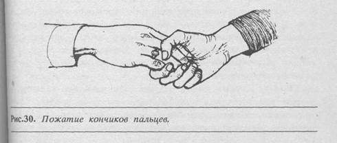 имеющими более широкую интимную зону. Сельчане, однако, при этом будут наклоняться вперед или даже балансировать на одной ноге. Пожатие кончиков пальцев напоминает пожатие прямой несогнутой рукой, невыполненное до конца: вместо руки, по ошибке, в ладонь заключаются только пальцы. Даже если инициатор приветствия дружелюбно настроен по отношению к реципиенту, фактически он не уверен в себе. Как и в предыдущем случае, цель этого рукопожатия заключается в том, чтобы держать партнера на удобном для себя расстоянии.