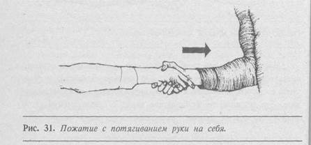 Доминантное рукопожатие есть наиболее агрессивный вид рукопожатия, т.к. оно дает человеку мало шансов на установление отношений равнопартнерства. Этот тип рукопожатий характерен для агрессивного, властного мужчины, который всегда является инициатором рукопожатия и жестом руки, с ладонью направленной вниз, заставляет человека подчиняться, потому что ему приходится отвечать рукой, повернутой ладонью вверх. Существует несколько способов обращения с доминантным рукопожатием. Вы можете пользоваться описанным выше способом, основанным на цепочке шагов, но иногда его трудно применять, т.к. обычно рука автора жеста бывает жесткой и напряженной, что не позволяет провести такой маневр. Очень простой способ – обхватить руку человека сверху за запястье и затем встряхнуть ее (рис.26). При таком способе вы становитесь хозяином положения, т.к. берете верх над рукой другого человека, а так как это может сбить с толку человека с властными намерениями, мы рекомендуем использовать это рукопожатие с определенными мерами предосторожности.