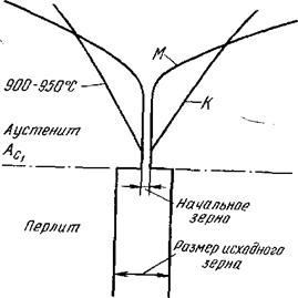 В наследственно мелкозернистой стали при нагреве до высоких температур (1000–1050 °С) зерно растет незначительно, однако при более высоком нагреве наступает бурный рост зерна. В наследственно крупнозернистой стали, наоборот, сильный рост зерна наблюдается даже при незначительном перегреве выше Ас1 (рис. 4.1).
