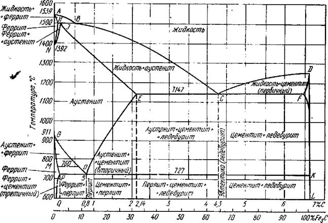 Компонентами системы железо-углерод (рис. 7.1) являются железо (Fе) и углерод (С). Железо и углерод образуют следующие фазы: жидкий раствор, аустенит, феррит, цементит и смесь фаз: перлит и ледебурит. Углерод при определенных условиях может выделяться в виде отдельной фазы: графит. Сплав железа с массовой долей углерода до 2, 14 % (рис. 7.1) называют сталью.