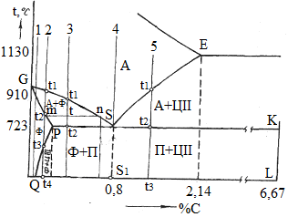 где П, % – площадь, занимаемая перлитом в структуре стали. Например, 30 % площади шлифа занято ферритом, 70 % перлитом. Тогда содержание углерода в стали будет равно 0, 56 %. Пример структуры доэвтектоидной стали изображен на рис. 7.2 в. Сплав 4 является примером эвтектоидной стали. Из диаграммы Fе-С (рис. 7.3) видно, что при температурах выше точки S сплав состоит из аустенита, а ниже точки S из феррита состава точки Р и цементита состава точки К. Это значит, что при температуре 727 °С (точка S) происходит распад аустенита по реакции АS ® ФP + ЦK. Образующаяся смесь феррита и цементита, как уже отмечалось, называется перлитом, а превращение аустенита в перлит называется эвтектоидным или перлитным превращением. После окончания перлитного превращения сплав будет охлаждаться далее; содержание углерода в пластинках феррита будет уменьшаться согласно линии РQ. При температуре 20 °С перлит будет состоять из пластинок феррита с содержанием углерода 0, 006 % (точка Q) и пластинок цементита с содержанием углерода 6, 67 % (точка L). Зерна перлита под микроскопом при небольших увеличениях имеют темный цвет. Структура перлита изображена на рис. 7.2 г. Сплав 5 – это пример заэвтектоидной стали. Ниже температуры t1 предельная растворимость углерода в аустените уменьшается согласно линии SE; лишний углерод из внутренних областей зерен аустенита диффундирует на поверхность зерен и образует по границам зерен аустенита сетку цементита вторичного. Когда сплав охладится до температуры эвтектоидного превращения (линия РSК), зерна аустенита будут иметь эвтектоидный состав точки S и превратятся в перлит. Количество выделившегося вторичного цементита определяется по формуле: