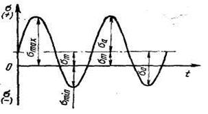 Циклы, схемы и виды нагружения. Цикл нагружения – это совокупность последовательных значений переменных напряжений за один период их изменения. Важнейшими параметрами цикла нагружения являются (рис. 13.5): 1. Максимальное (σ max) и минимальное (σ min) значения напряжения цикла. 2. Размах напряжения цикла: Δ σ = σ max - σ min. 3. Амплитуда напряжения: σ a = 0, 5(σ max - σ min). 4. Среднее напряжение цикла: σ m = 0, 5(σ max + σ min). 5. Коэффициент асимметрии цикла нагружения: R = σ min/σ max. 6. Частота и период нагружения: f = 1/T.