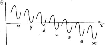 Рисунок 13.6 – Виды знакопостоянных (а, ж), знакопеременных (в, г, д) и отнулевых (б, е) циклов нагружения: а – растягивающие (0< R< 1); б – отнулевой (R= 0); в – преимущественно растягивающие (-1< R< 0); г – симметричный (R= -1); д – преимущественно сжимающие (-∞ < R< -1); е – отнулевой сжимающий (R= -∞); ж – сжимающие (1< R)