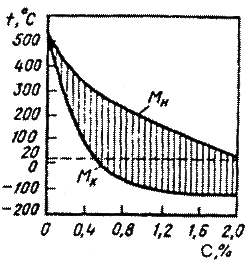 Чем больше в стали углерода, тем больше искажена решетка мартенсита и тем выше его твердость. Поэтому мартенсит в высокоуглеродистых сталях может иметь очень высокую твердость (до 65 НRC). Как уже отмечалось в предыдущей работе, высокая твердость мартенсита обусловлена, во-первых, искажениями кристаллической решетки и, соответственно, большими внутренними напряжениями; во-вторых, возникновением фазового наклепа вследствие увеличения объема при превращении аустенита в мартенсит. Мартенситные превращения начинаются при некоторой температуре МН (начало мартенситных превращений) и заканчивается при температуре МК (конец мартенситных превращений). Положение точек МН и МК не зависит от скорости охлаждения, но зависит от содержания углерода в стали (рис. 19.2). Если содержание углерода в стали превышает 0, 6-0, 7 %, то МК лежит в области отрицательных температур. Это значит, что после полного охлаждения стали в ее структуре, помимо мартенсита, будет присутствовать остаточный аустенит, понижающий твердость закаленной стали. В этом случае, чтобы получить максимальное количество мартенсита, необходимо после закалки в воде сделать еще и обработку холодом.