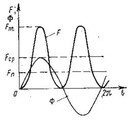 Однофазные электромагниты переменного тока. При включении катушки электромагнита в сеть переменного тока мгновенное значение тяговой силы не является постоянной величиной, а изменяется вместе с изменением во времени величины потока в системе.
