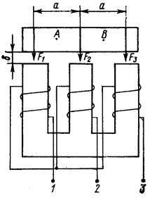 Из рис. 1.2.2 следует, что идеально было бы иметь потоки Ф1 и Ф2, сдвинутые на 90° и равные по величине (j = 90°, Ф1 = Ф2), Но, как видно из векторной диаграммы (рис. 1.2.3), выполнить одновременно эти условия невозможно. При равенстве потоков Ф1 и Ф2 угол j = 0, а при j = 90° один из потоков будет стремиться к нулевому значению. При поиске оптимального решения учитывают величину и угол вектора Фк, т. е. электрические характеристики короткозамкнутого кольца. В реальных системах угол j составляет 50°—80°. Трехфазные электромагниты. На судах трехфазные электромагниты применяются в механических тормозных устройствах электрических приводов, в грузоподъемных устройствах для удержания грузов на весу и т. д. Электромагниты трехфазного тока. На рис. 1.2.4 приведена схема электромагнита трехфазного тока. Обмотки питаются от сети трехфазного тока. Трехфазный электромагнит можно рассматривать как три однофазных, токи в которых сдвинуты друг относительно друга на 120°. Такой же сдвиг имеют и потоки. Если амплитуды токов во всех фазах одинаковы, то между якорем и каждым сердечником действуют силы F1, F2 и F3. Суммарная сила F, действующая на якорь, будет по времени постоянна. Однако точка приложения результирующей силы будет с двойной частотой перемещаться по якорю. Точка приложения суммарной силы будет отстоять от оси крайнего сердечника на расстоянии а /2 тогда, когда в одной из крайних фаз ток пройдет через нуль (точки А и В). Когда ток в средней фазе проходит через нуль, точка приложения суммарной силы расположена на оси среднего сердечника. Следовательно, точка приложения суммарной силы будет перемещаться между точками А и В. Так как обычно противодействующее усилие действует на якорь в одной точке, а результирующая сила перемещается, то в трехфазном электромагните также может наблюдаться вибрация якоря. Таким образом, у трехфазного электромагнита при включении его в симметричную трехфазную сеть результирующая сила на якоре в 1, 5 раза больше максимальной и в 3 раза больше средней силы однофазной магнитной системы. Однако в этом случае и объем железа в 1, 5 раза больше, а значит, использование стали магнитопровода в 2 раза меньше, чем у сравниваемого по силе электромагнита постоянного тока.