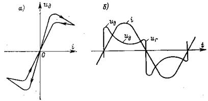 В электрической дуге переменного тока независимо от степени ионизации дугового промежутка напряжение и ток каждый полупериод проходят через нуль. На рис. 1.2.10 приведены кривые изменения тока и напряжения на дуговом промежутке в зависимости от времени. В момент появления тока напряжение резко нарастает до значения и з (напряжения зажигания). По мере возрастания тока оно падает и при максимальном токе имеет минимальное значение. Затем напряжение на дуге снова возрастает и достигает значения и г (напряжения погасания) при токе, равном нулю. Напряжение дуги в течение полупериода меняет свое значение, а за период — и свой знак. Если снять вольт-амперную характеристику дуги за период, то она будет иметь вид, приведенный на рис. 1.2.10. Стрелки на рисунке показывают направление изменения тока при снятии характеристики. Момент перехода тока и напряжения через нуль совпадают. Площадь, ограниченная кривой Принципиально электрическая дуга переменного тока, как и дуга постоянного тока, окончательно погаснет тогда, когда скорость деионизации дугового промежутка будет больше скорости его ионизации. Гашение дуги переменного тока может произойти в два принципиально различных момента времени — в середине полупериода (рис. 1.2.11, а) или в его конце, когда ток проходит через нуль (рис. 1.2.11, б). В первом случае снижение тока до нуля можно получить только путем кратковременного создания в дуговом промежутке большого сопротивления. Увеличение сопротивления дуги происходит за счет преобладания процессов деионизации дугового промежутка над процессами ионизации. Таким образом, при разрыве тока в середине полупериода процесс гашения дуги переменного тока аналогичен процессу гашения дуги постоянного тока. Поэтому уменьшение тока до нуля в середине полупериода приводит, как и при гашении дуги постоянного тока, к значительным перенапряжениям. Обычно окончательное гашение дуги переменного тока происходит в моменты перехода тока через нуль. При прохождении тока через свое нулевое значение энергия к дуге не подводится, а температура ее резко падает. Поэтому, пока ток близок к нулевому значению, интенсивность ионизации значительно уменьшается, а деионизация сильно возрастает. Дуговой промежуток за это время теряет свою проводимость, и дуга гаснет. В начале и конце каждого полупериода ток в дуге изменяется по закону, отличному от синусоидального. Величина тока в конце одного полупериода и начале следующего определяется уравнением Нулевая пауза t п зависит от интенсивности деионизации дугового промежутка и параметров цепи. Обычно она колеблется от нескольких сот до нескольких тысяч микросекунд. В результате интенсивной деионизации в данный отрезок времени уменьшается проводимость дугового промежутка, и он превращается в диэлектрик. Одновременно с этим на нем растет напряжение, так что ток в дуге, равный Условие гашения дуги переменного тока можно сформулировать следующим образом: если после прохождения тока через нуль электрическая прочность дугового промежутка в каждый заданный момент времени будет выше напряжения на нем, то дуга погаснет. Если в какой-либо момент времени напряжение, приложенное к дуговому промежутку, станет выше электрической прочности промежутка, то процесс гашения дуги прекратится и дуга загорится вновь. Снижение сте