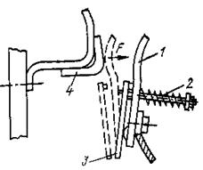 Вибрация контактов тесно связана с механическими и электродинамическими силами, возникающими в контактных соединениях. Процесс вибрации при соударении контактов рассмотрим на примере контактного механизма, изображенного на рис. 1.2.22. Подвижный контакт 1 связан с контактным рычагом 3 через контактную пружину 2. Под действием электромагнита подвижный контакт подходит к неподвижному 4 с определенной скоростью. В момент соприкосновения контактов возникает удар, в результате которого происходит деформация материалов контактов. Упругая деформация приводит к отбросу подвижного контакта вправо на расстояние порядка долей миллиметра. Между контактами образуется зазор и загорается дуга. Движение контакта вправо прекратится тогда, когда энергия, полученная им при ударе, перейдет в энергию сжатия пружины 2. Затем под действием контактной пружины контакт 1 начнет перемещаться влево. Происходит повторное замыкание контактов, удар и новый отброс контакта. Этот процесс может повторяться несколько раз с затухающей амплитудой. Вибрация контактов может возникнуть вследствие удара якоря магнитной системы. В этом случае вибрация и износ контактов могут быть большими, чем от удара самих контактов. При вибрации контактов многократно образуются короткие дуги, которые вызывают оплавление и распыление материала контактов. Износ контактов уменьшает их взаимное нажатие во включенном состоянии и приводит к повышению переходного сопротивления. Для уменьшения вибрации контактная пружина имеет предварительное сжатие при разомкнутых контактах. Поэтому в момент касания контактов сила нажатия возрастает не с нуля, а со значения, определяемого предварительным начальным нажатием контактов. Начальное нажатие на контакты в момент их соприкосновения представляет собой силу, противодействующую отбросу контактов при их соударении. Следовательно, чем больше эта сила, тем меньше будет отброс и вибрация.