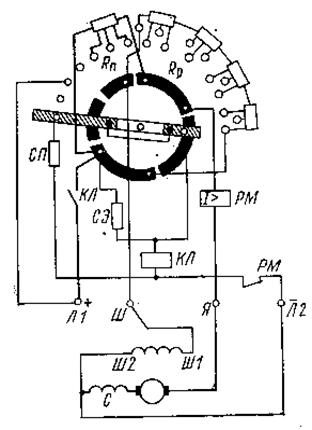 При снижении напряжений в сети ниже допустимой величины (0, 5 Uном) или при его исчезновении контактор КЛ отключается и обесточивает двигатель. Появление и восстановление напряжения не вызывает самопроизвольного пуска двигателя, так как цепь питания катушки контактора разомкнута. Повторный пуск двигателя производится только после установки контактной щетки в исходное положение. Минимальная защита, осуществляемая линейным контактором КЛ, не допускает работу двигателя при низком напряжении сети и не позволяет включить его на полное напряжение сети при выведенном пусковом резисторе из цепи якоря, т. е. предохраняет электрические цепи двигателя от повреждения большим пусковым током. Максимальную защиту обеспечивает реле РМ, размыкающие контакты которого включены в цепь катушки линейного контактора, а втягивающая катушка — в главную цепь двигателя. При срабатывании реле его контакты размыкают цепь катушки контактора, который, отключаясь, размыкает цепь якоря двигателя. Ток уставки максимального реле равен двойному номинальному току двигателя. Для реостатов ударостойкого исполнения ток уставки реле равен трехкратному номинальному току двигателя. Остановка двигателя производится переводом контактной щетки в крайнее левое положение. При этом она шунтирует катушку линейного контактора через первый неподвижный контакт. Отключение двигателя можно производить также и дистанционным отключающим устройством — автоматическим или с кнопочным управлением. В ударостойких реостатах для подключения дистанционных отключающих устройств предусмотрен дополнительный зажим Ш1, соединенный с зажимом Ш перемычкой. Размыкающие контакты отключающего устройства подсоединяются к зажимам Ш и Ш1 после удаления перемычки с этих зажимов. При срабатывании дистанционного отключающего устройства, его контакты размыкают цепь катушки линейного контактора. Линейный контактор, примененный в ударостойких реостатах, автоматически включается повторно в случаях его отключения вследствие сильной вибрации или сотрясения от удара. Достигается это с помощью дополнительного размыкающего вспомогательного контакта и предохранительного резистора СП. Они включены параллельно экономическому резистору и обеспечивают возбуждение втягивающей катушки линейного контактора от противо-ЭДС двигателя в момент размыкания главного контакта контактора в результате сотрясения или сильной вибрации. В ударостойких реостатах минимальная защита срабатывает при снижении напряжения в сети в пределах от 25 до 40%, а в реостатах других исполнений от 25 до 65% номинального значения. Пусковые реостаты не предназначены для частых пусков. Контактор может отключать свой трехкратный номинальный ток не более трех раз подряд при напряжении сети, превышающем номинальное значение не более чем на 10%. Для выбора пускового реостата необходимо знать следующие данные: мощность двигателя, условия пуска и вид нагрузки, напряжение питания двигателя. По этим параметрам из каталога выбираем величину реостата и номера элементов резистора. Пускорегулировочные реостаты. Аналогичную конструкцию имеют пускорегулировочные реостаты серии РЗР. Схема соединений пускорегулировочного реостата приведена на рис. 6.1.3. Пуск и регулирование частоты вращения осуществляются перемещением к