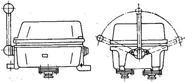 Командоконтроллеры серий КН и КТ рассчитаны на применение в цепях управления переменного тока напряжением до 380В и постоянного тока напряжением до 220В. Командоконтроллер представляет собой блок кулачковых элементов цепи управления с приводом от общего кулачкового вала, заключенный в водозащищенный корпус. В блоке может быть до 12 кулачковых элементов, каждый из которых имеет привод от шайбы с определенным профилем. Число рабочих положений главного вала до пяти в каждую сторону от нулевого. Командоконтроллеры серии КН (рис. 7.2.3) применяются для различных крановых механизмов и устанавливаются на подставках или подвешиваются. Они не имеют выключателя управления. Командоконтроллеры серии КТ (рис. 7.2.4) применяются для управления различными палубными механизмами и устанавливаются на тумбе на открытой палубе. Она снабжаются выключателями управления со съемной рукояткой. Некоторые исполнения имеют встроенную в тумбу кнопку для шунтирования тепловых реле, амперметр и сигнальную неоновую лампу. Командоконтроллеры серии КН выполняются с рукояткой или маховичком, а серии КТ только с рукояткой. Номинальный ток контроллеров 10А. Допустимый ток включения 50А. Допустимый ток отключения и электрическая износоустойчивость такие же, командоконтроллеров серии КВО. Каждая серия командоконтроллеров имеет несколько типов, отличающихся диаграммой переключения контактов.
