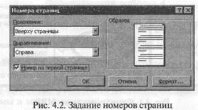 1. Скопируйте документ, созданный в Задании 4.1, четыре раза, пользуясь пунктами меню Правка/Копировать и Правка/Вставить или соответствующими кнопками на панели инструментов, а так же горячими клавишами. Выполните принудительное разделение на страницы после каждого информационного письма клавишами [Ctrl]-[Enter]. В результате этих действий каждое информационное письмо будет располагаться на новой странице. Задайте нумерацию страниц (вверху страниц, справа) командой Вставка/Номера страниц (рис. 4.2). 2. Отформатируйте первый абзац текста каждого информационного письма командами Формат/Абзац следующим образом: • 1-е письмо: шрифт Times New Roman Cyr, 12, с красной строкой (отступом); выравнивание — по ширине; • 2-е письмо: шрифт Arial Cyr, 14, с висячей строкой (выступом); выравнивание — по левой границе; абзацные отступы — по 2 см слева и справа;