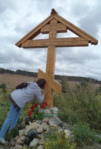 У поклонного креста Этим летом мы путешествовали. Получилось, своего рода, семейное минипаломничество. 11 августа побывали в местечке Опоки, в 70 км от Великого Устюга. В советское время там находился лагерь Опокстрой. Заключенные лагеря строили плотину на реке Сухоне. Хочется добавить, что об этом месте мы узнали случайно по интернету. Появилось желание там побывать. Экскурсию проводила экскурсовод-краевед Бычихина Ольга Васильевна, уже несколько лет вплотную занимающаяся темой истории места Опоки, в том числе Опокстроя. Что очень порадовало меня лично, Ольга Васильевна привлекает к этому делу школьников. Сама она школьный учитель в поселке Полдарса. Вот уже несколько лет они с группой девочек-школьниц исследуют место Опоки. Как говорит сама Ольга Васильевна, важно, чтобы дети помнили и знали о страшных страницах истории нашей страны, чтобы хранили и пытались донести память о невинных страдальцах, жертвах лагерей. Они уже издали книгу, посвященную Опокстрою, выступили на нескольких конференциях, посвященных памяти. В деревне Порог (ранее называвшейся Опоки) они беседовали со старожилами – свидетелями Опокстроя. Ее рассказ был построен не только на основании сухого материала, вычитанного в каких-нибудь мемуарах, были здесь еще и живые свидетельства. В Опокстрое работали политзаключенные и, так называемые, бытовики, люди, приговоренные к работам в лагерях за какие-либо провинности: мелкие кражи, опоздания на работу, какие-нибудь административные нарушения. Одна женщина, местная жительница деревни Порог рассказала, что ее бабушка провожала своего мужа в армию и опоздала на работу, за что и была приговорена к исправительным работам в Опокстрое. Также есть свидетельства о тяжести работы и жизни заключенных. Жили они в земляных бараках, где на одного человека жилплощади приходилось по 2 кв. метра. Остатки этих бараков нам удалось увидеть. Это длинные борозды-углубления в земле, поросшие травой. Сверху была деревянная крыша. А вначале я подумала, почему же такая неровная поверхность земли, вся изрытая… Проходили мимо огорода. Там во времена Опокстроя выращивали капусту для заключенных. Кормили их почти исключительно капустой. Землю на плотину вывозили с помощью лошадей. Работы были очень тяжелые. Сохранились документы – медицинские карты заключенных из больницы лагеря. Ольга Васильевна их просматривала. Также сохранились статистические данные: в основном заключенные умирали от истощения, пневмонии, тяжелых ушибов грудной клетки. Хоронили их в общих ямах. По словам очевидцев – просто зарывали в снег. Место захоронения – Пупский Лог. Поклонный крест в честь невинно погибших в Опокстрое по инициативе одной местной жительницы был установлен в день праздника Петра и Павла Денисом Скударем, мастером резьбы по камню. После экскурсии удалось пообщаться с Ольгой Васильевной. Мы рассказали о нашем Заостровском приходе, как местные жители отстояли храм в советское время, собирали подписи с риском для собственной жизни. О том, что мы тоже подготовили презентацию о священнослужителях, служивших в советское время в Заостровском храме и пострадавшим или убитым в годы гонения. Пригласили Ольгу Васильевну принять участие в семинаре, посвященном памяти жертв политических репрессий 30 октября, который будет проводиться в Архангельской 