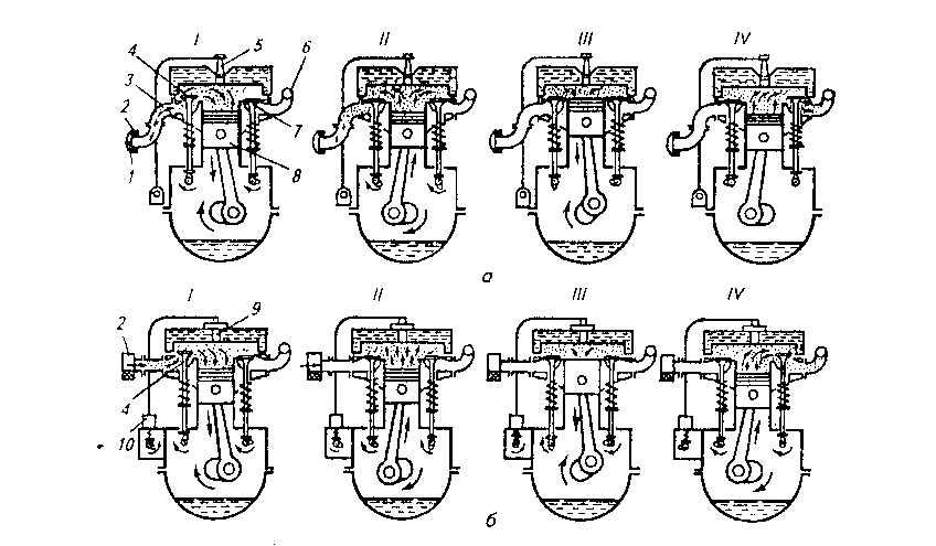 а, б - рабочий цикл соответственно карбюраторного и дизельного двигателей I – такт впуска; II – такт сжатия; III – рабочий такт; IV – такт выпуска 1 – карбюратор; 2 – воздухоочиститель; 3 – впускной трубопровод; 4 – впускной клапан; 5 – искровая свеча зажигания; 6 – выпускной трубопровод; 7 – выпускной клапан; 8 – поршень; 9 – форсунка; 10 – топливный насос
