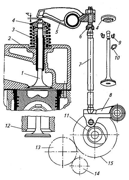 В поршне 7 из алюминиевого сплава различают днище, головку (уплотняющую часть), юбку (направляющую часть) и бобышки (внутренние приливы). В зависимости от принятого на двигателе способа смесеобразования, расположения клапанов и форсункок (или свечей зажигания) днище поршня бывает плоским, фасонным с выемкой или выпуклым (у пусковых двигателей). Все детали КШМ условно делят на две группы: шатунно-поршневую группу и группу коленчатого вала. В состав первой группы входят следующие основные детали: На внешней поверхности поршня проточены канавки для установки компрессионных (уплотняющих) и маслосъемных колец. По окружности канавок под маслосъемные кольца просверлены сквозные отверстия для отвода излишек масла в картер двигателя. На внутренней поверхности поршня имеется два прилива — бобышки, в отверстия которых устанавливают поршневой палец 6 и стопорные кольца 32. Палец 6 соединяет поршень 7 с шатуном 5. Шатун5 изготовляют из высококачественной стали двутаврового сечения в виде стержня с двумя головками: верхняя головка неразъемная, а нижняя - разъемная. Съемную часть называют крышкой 14. Ее крепят шатунными болтами 15. Для обеспечения уравновешенности двигателя комплект поршней с шатунами в сборе подбирают с минимальной разностью по массе. Разность масс поршней с шатунами в пределах комплекта не должна превышать нормируемого значения. Например, у дизеля Д-240 не более 15 г, СМД-60 не более 17 г, А-41 не более 30 г. В состав второй группы входят: Коленчатый вал через шатуны воспринимает усилия от поршней и преобразует их во вращающий момент, который передается через трансмиссию на ведущие движители (колеса или гусеницы), а также используется для привода различных механизмов и устройств двигателя (распределительного вала механизма газораспределения, масляного, топливного и водяного насосов, генератора, вентилятора и др.). Коленчатый вал штампуют из высококачественной стали или отливают из высокопрочного чугуна. Вал состоит из коренных 2 и шатунных шеек 4, щек, носка 23 и хвостовика. К щекам могут быть прикреплены или отлиты вместе с валом противовесы. Маховик 13 – это массивный чугунный диск, который во время работы ДВС накапливает кинетическую энергию, необходимую для вращения коленчатого вала в течение трех подготовительных тактов. Газораспределительный механизм с л у ж и т для своевременного наполнения цилиндров свежим зарядом (воздухом или горючей смесью) и выпуска из цилиндров отработавших газов. В четырехтактных ДВС применяют газораспределительные механизмы с подвесными клапанами, размещенными в головке цилиндров – верхнее расположение клапанов и нижним (боковым) расположением клапанов. Газораспределительный механизм с о с т о и т из следующих деталей (рис. 8): · впускных и выпускных клапанов 1 с пружинами 3; · передаточного механизма (толкатель 8, штанга 7, коромысло 5); · привода (распределительный кулачковый вал 11, зубчатая 13, 14, 15 или цепная передача). П р и н ц и п р а б о т ы ГРМ: вращение от шестерни 14 коленчатого вала через промежуточную шестерню 13 передается на шестерню распределительного вала 15 с частотой, вдвое меньшей частоты вращения коленчатого вала. Каждый кулачок распределительного вала, набегая на толкатель 8, поднимает его вместе со штангой 7. Штанга поднимает короткое плечо коромысла, а другой его конец (длинное плечо)