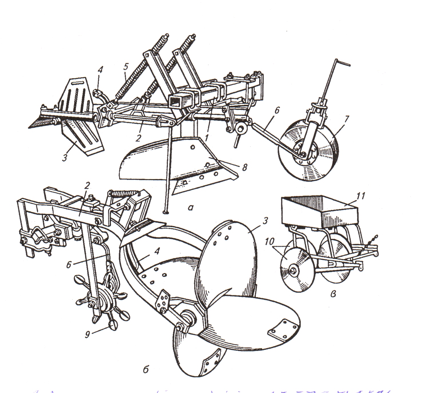 Борьба с водной эрозией, которая проявляется на склонах, включает в себя систему организационных и агротехнических мероприятий, в том числе: · пахать на склонах необходимо поперек склона, по горизонтали; · вспашка должна быть с почвоуглубителями или вырезными корпусами с одновременным образованием перемычек и валиков в бороздах; · глубокая вспашка, повышающая водопоглащающую способность почвы, дает хороший эффект в задержании талых вод; · ступенчатая вспашка склонов крутизной до 4 градусов плугом, у которого один корпус нестандартный с удлиненным отвалом, за счет чего образуются земляные валики поперек склона. Валики задерживают сток воды. Промышленность выпускает навесной плуг ПЛН-4-35 с приспособлением ПРНТ-70.000, предназначенный для прерывистого бороздования. У с т р о й с т в о: плуг снабжен корпусом с укороченным отвалом и приспособлением для прерывистого бороздования (рис. 44, а), рабочим органом которого служит трехлопатная крыльчатка 3. П р и н ц и п д е й с т в и я приспособления ПРНТ-70.000: при движении плуга на пути, равном длине обода опорного колеса 7, крыльчатка не вращается, и лопасть, находящаяся внизу, делает борозду. От вращения крыльчатку в этот момент удерживает подпружиненный рычаг 4, связанный тягами с кривошипно-шатунным механизмом, работающим от опорного колеса. За каждый оборот колеса рычаг отводится один раз, а затем под действием пружины возвращается в исходное положение. За это время крыльчатка поворачивается на угол 120º, бороздка прерывается образовавшейся перемычкой. Приспособление крепится к раме плуга при помощи поперечного бруса 1. Крыльчатка, расположенная позади корпуса с укороченным отвалом, образует бороздки длиной 1, 0…1, 2 м и вместительностью 95…100 дм3. Пропашной культиватор КРН-4, 2Б с приспособлением ППБ-0, 6 п р е д н а з н а ч е н для прерывистого бороздования и глубокого рыхления междурядий пропашных культур. У с т р о й с т в о (рис. 44, б): приспособление ППБ-0, 6 с о с т о и т из бороздооткрывающих окучников, устанавливаемых вместо культиваторных лап, и четырехлопастных крыльчаток 3, расположенных за окучниками. П р и н ц и п д е й с т в и я: мерный диск 9 периодически отводит рычаг 4 от лопасти, крыльчатка поворачивается, и в борозде образуется перемычка. Размер борозд: длина 1 м, ширина 0, 5 м и глубина 0, 16 м. Дисковые лущильники с приспособлениями ПЛДГ-5 и ПЛДГ-10 п р е д н а з н а ч е н ы для образования замкнутых лунок по зяби. У с т р о й с т в о приспособления ПЛДГ (рис. 44, в): в комплект ПЛДГ-5 входят четыре, ПЛДГ-10 – шесть дисковых батарей с эксцентрично расположенными дисками. Угол атаки дисков 30º.