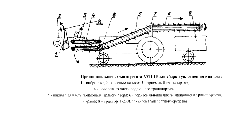 1 – вибронож; 2 – опорное колесо; 3 – приемный транспортер; 4 – поворотная часть подающего транспортера; 5, 6 – соответственно наклонная и горизонтальная часть подающего транспортера; 7 – рама; 8 – трактор Т-25Л; 9 – кузов транспортного средства