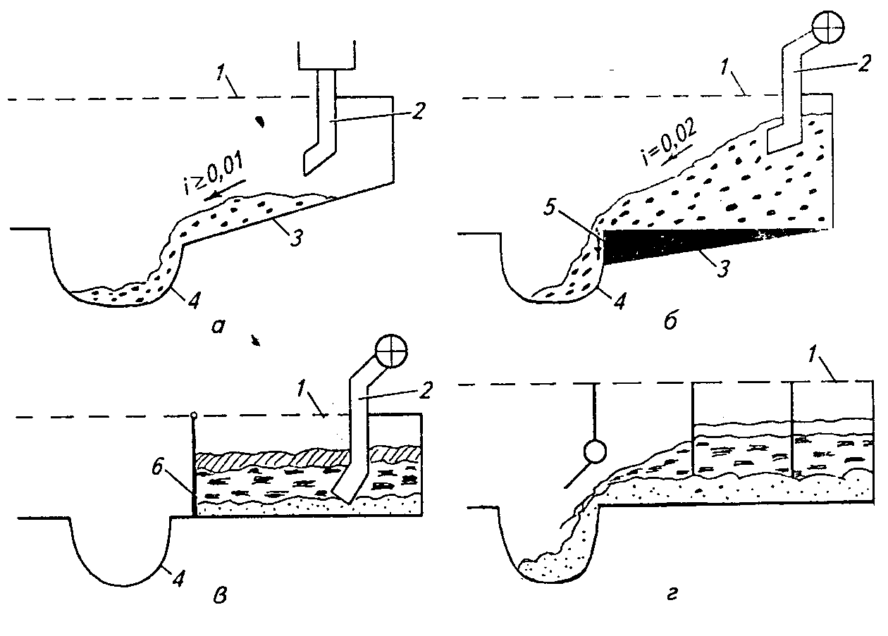 а – смывная; б – самотечная непрерывного действия; в – шиберная; г – секционная 1 – решетчатый пол; 2 – система смыва; 3 и 4 – продольный и поперечный каналы; 5 – порожек; 6 – шибер