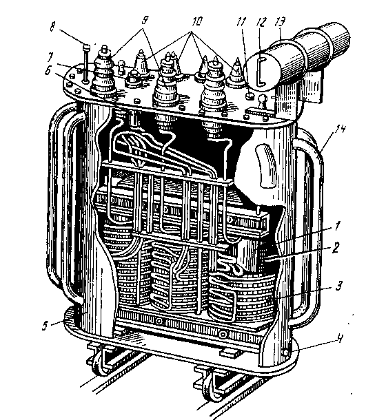 а б а – однофазный трансформатор: 1 – первичная обмотка; 2 – сердечник; 3 – вторичная обмотка; 4 – нагрузка б – трехфазный силовой трансформатор: 1 – сердечник; 2 – первичная обмотка; 3 – вторичная обмотка; 4 – пробка для спуска масла; 5 – бак; 6 – переключатель напряжения; 7 – вывод переключателя; 8 – термометр; 9 – выводы высшего напряжения; 10 – вводы низшего напряжения; 11 – пробка для заливки масла; 12 – маслоуказатель; 13 – расширитель; 14 – радиатор Рисунок 100 – Трансформаторы напряжения