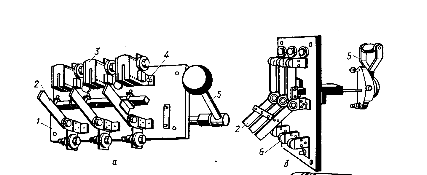 а – с боковой рукояткой и дугогасительной камерой; б – с центральной рукояткой и моментным дугогасительным ножом 1 – изолирующая плита; 2 – контактный нож; 3 – дугогаситсльная камера; 4 – неподвижная контактная стойка; 5 – рукоятка; 6 – неподвижный контакт