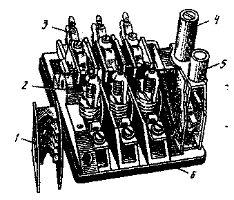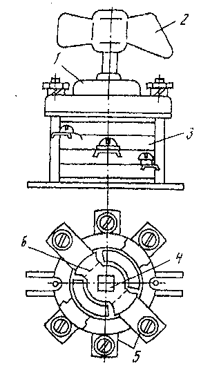 Аппаратура ручного управления приводится в действие обслуживающим персоналом. К ней относятся: выключатели и переключатели, рубильники, кнопочные станции, магнитные пускатели, автоматические выключатели. Рубильники п р е д н а з н а ч е н ы для неавтоматического замыкания и размыкания цепей переменного тока напряжением до 500 В. Рубильники с о с т о я т (рис.102) из системы подвижных (ножи) 2 и неподвижных 6 контактов, смонтированных на плите 1 из нетокопроводящего материала. Конструктивно могут быть выполнены с центральной (рис. 102, б), боковой рукояткой (рис. 102, а) и рычажным приводом. П р и н ц и п д е й с т в и я рубильников: поворотом рукоятки 5, соединенной с подвижными главными ножами, вводят их в зацепление с неподвижными контактами, вследствие чего происходит замыкание электрической цепи. Пакетные выключатели и переключатели п р е д н а з н а ч е - н ы для тех же операций, что и рубильники, в электрических цепях небольшой мощности. Пакетный выключатель с о с т о и т (рис. 103) из отдельных сложенных вместе пакетов 3 и приводного механизма 1. Каждый из пакетов образует полюс, включаемый в одну цепь выключателя. Неподвижные контакты каждого пакета занимают определенное положение, смещенное по отношению к контактам других пакетов. Неподвижные контакты 5 выполнены в виде массивных пластин из латуни, подвижные 6 – в виде двух пружинящих губок, которые посажены на квадратный изолированный вал 4 выключателя с рукояткой 2 и могут поворачиваться вместе с ним.