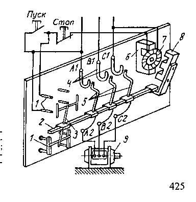 П р и н ц и п д е й с т в и я: при вращении рукоятки 2 сначала заводится пружина, которая сообщает необходимую скорость подвижным контактам. Перемещение по окружности подвижных контактов приводит к их набеганию на неподвижные, вследствие чего происходит замыкание электрической цепи. Дальнейшее вращение рукоятки выключателя приводит к размыканию цепи. Контакторы переменного тока п р е д н а з н а ч е н ы для дистанционного включения и выключения электроустановок. У с т р о й с т в о (рис. 104) на плите из нетокопроводящего материала смонтирована система неподвижных 4 и подвижных главных контактов 5, а также блокировочных контактов 1. За соединение подвижных и неподвижных контактов отвечает электромагнит, в состав которого входит сердечник 6, обмотка 7 и якорь 8, одним концом насаженный на вал 2. Главные неподвижные контакты А1, В1, С1 запитаны из трехфазной сети. К главным подвижным контактам А2, В2, С2 присоединяют статорную обмотку электродвигателя 9. Дистанционное управление электрической установкой осуществляют с помощью кнопок «Пуск» и «Стоп». П р и н ц и п д е й с т в и я: при нажатии на кнопку «Пуск», катушка контактора 6, по которой протекает ток, втягивает якорь магнитной системы 8 и замыкает контакты силовой цепи и блокировочные, в результате чего на электрическую установку поступает ток из сети. Блокировочные контакты включены параллельно кнопке «Пуск» и оставляют цепь питания катушки замкнутой и после того, как кнопка «Пуск» будет отпущена.