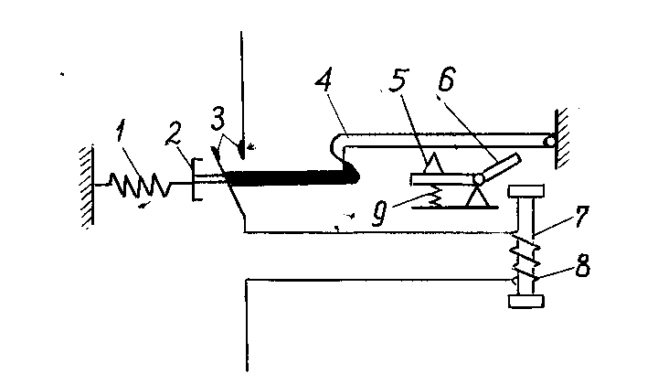 а б а – общий вид: 1 – дугогасительная камера; 2 – электромагнитный расцепитель; 3 – главные контакты; 4, 5 – соответсвенно конопки «Пуск» и «Стоп»; 6 – основание б – кинематическая схема электромагнитного расцепителя: 1, 9 – пружины; 2 – перемычка; 3 – электрические контакты; 4 – защелка; 5 – толкатель; 6 – якорь; 7 – сердечник; 8 – катушка