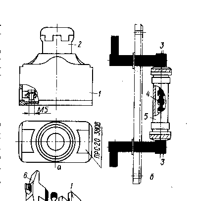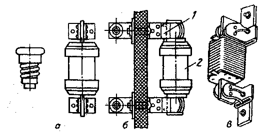 а – пробочный предохранитель серии ПРС; б – трубчатый предохранитель типа ПР-2; в – призматический предохранитель типа ПН-2 1 – основание предохранителя; 2 – ввертываемый цилиндрический корпус с плавкой вставкой; 3 – контактные ножи; 4 – плавкая вставка; 5 – фибровый патрон