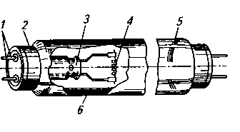 1 – штыревые токоподводы; 2 – цоколь; 3 – стеклянная ножка; 4 – электрод; 5 – колба; 6 – люминофор