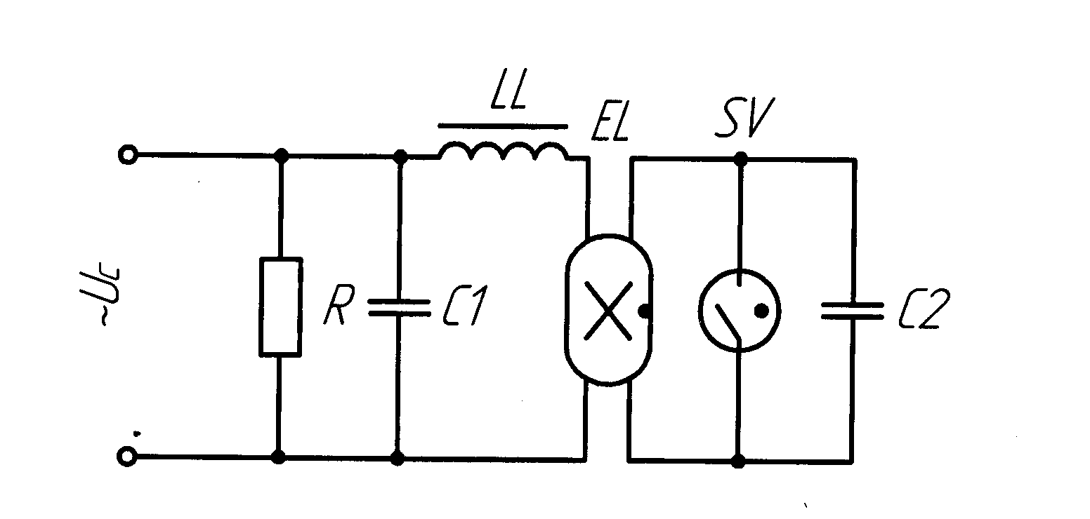У с т р о й с т в о (рис. 108): люминесцентная лампа п р е д с т а в - л я е т собой запаянную цилиндрическую стеклянную колбу 5 в форме трубки, внутренняя поверхность которой покрыта слоем люминофора 6 – вещества, способного светиться под действием УФ лучей. У концов колбы расположены спиральные фольфрамовые электроды 4 с выводами наружу в виде штырьков 1. Лампа заполнена аргоном и содержит несколько капель ртути. Для работы люминисцентных ламп необходима пускорегулирующая аппаратура в виде дросселя, стартера и двух конденсаторов. Стартер (SV) – неоновая лампа тлеющего разряда. В ней один из электродов – биметаллическая пластинка, которая может замыкать и размыкать цепь электродов лампы. Поэтому стартер с л у ж и т для автоматического замыкания на некоторое время цепи электродов ламп и для мгновенного разрыва этой цепи после разогрева электродов. Дроссель (LL) – индуктивное сопротивление, которое с л у ж и т для ограничения тока лампы, для создания импульса повышенного напряжения, необходимого для зажигания лампы. Конденсатор (С2), подсоединенный параллельно стартеру, с л у- ж и т для снижения радиопомех, предотвращения возникновения дуги между контактами стартера в момент их размыкания, увеличения импульса зажигания лампы. Конденсатор (С1), подключенный параллельно цепи, с л у ж и т для повышения коэффициента мощности схемы с 0, 5…0, 6 до 0, 9. Сопротивление (R) с л у ж и т для разряда конденсаторов С1 и С2 после отключения лампы от сети. П р и н ц и п д е й с т в и я: при включении люминесцентной лампы в сеть электрический ток нагревает ее электроды до температуры 800…9000С. При этом, вследствие возникновения явления термоэлектронной эмиссии из электродов начинают вылетать электроды, образующие около каждого электрода электронные облачка. Находящаяся внутри лампы ртуть способствует появлению паров ртути.