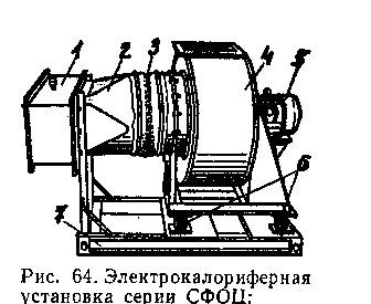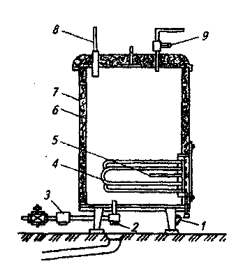 Элементный водонагреватель УАП-200/0, 9-И2 (рис. 114) выполнен в виде цилиндрического резервуара 7, на поверхности которого уложен теплоизоляционный синтетический пеноматериал 6, благодаря чему температура воды при отключении напряжения снижается на 0, 8º С за 1 час. Резервуар установлен на трех ножках. В правой нижней боковой части резервуара посредством патрубка с фланцем укреплены три ТЭНа 4 мощностью по 2 кВт. С помощью датчика и температурного реле, размещенных на фланце, осуществляется автоматический режим работы водонагревателя и поддержание постоянства температуры воды 90º С. С целью обеспечения безаварийной работы элементного водонагревателя и исключения его взрыва, на крышке резервуара установлен предохранительный клапан 9, который срабатывает при повышении давления внутри резервуара выше допустимого значения. Разбор воды из электроводонагревателя осуществляется путем перелива, при этом нагретая вода вытекает через верхний разборный патрубок резервуара за счет давления холодной воды, поступающей из водопровода через нижний приточный патрубок. Это исключает возможность «сухой» работы водонагревателя, так как разбор горячей воды и нагрев поступающей холодной воды происходит одновременно. Электрокалориферные установки п р е д н а з н а ч е н ы для подогрева воздуха в системах вентиляции, установках для создания микроклимата на животноводческих фермах и птицефабриках, вентиляции картофелехранилищ и теплиц.