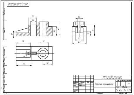 Рисунок 4.2 Пример выполнения листа 2 4.3 Лист 3 Построение изображений деталей по аксонометрической проекции. Построение изображений детали по аксонометрической проекции. рекомендуется т выполнять в следующей последовательности 1) Изучить ГОСТ 2.305-68 и рекомендуемую, литературу, ознакомиться с методическими указаниями. 2) Внимательно ознакомиться с данным аксонометрическим изображением детали, мысленно расчленить деталь на элементарные геометрические тела. 3) Подготовить поле чертежа – провести рамку, вычертить основную надпись. 4) Выделить соответствующую площадь для каждого вида детали. 5) В тонких линиях нанести участки видимого и невидимого контура детали. 6) Проставить на чертеже размеры и оформить надписи. 7) Проверить правильность всех построений. обвести чертеж. Выполнение чертежа необходимо начать с построения осей проекций, затем следует провести оси симметрии видов, определить расстояние между видами, исходя из размеров и расположения видов, нанесения размеров и др. Затем построить главный вид и используя свойства проекционной связи, - вид сверху. По двум построенным видам вычертить вид слева. В случае, если деталь сложная, то каждый элемент детали рекомендуется изображать одновременно на всех видах. При выборе положения для главного вида, в соответствии с ГОСТ 2.305-68 деталь располагают так, чтобы как можно больше ее элементов изображалось видимыми. Главный вид должен давать наиболее полное представление о формах и размерах детали. С целью уменьшения количества изображений допускается на видах показывать невидимые части поверхности детали при помощи штриховых линий. Названия основных видов на чертеже не надписывают, если не нарушена их проекционная связь с главным видом. При нарушении этой связи виды надписывают по типу «А». Стрелка с аналогичной буквой на чертеже должна указывать направление взгляда. После окончания чертежа, заполнить основную надпись. Пример выполнения задачи представлен на рисунке 4.3. Варианты задач размещены в приложении Б.