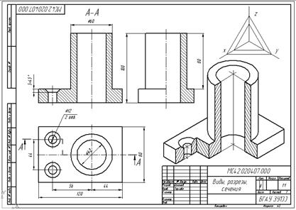 Рисунок 4.3 пример выполнения листа 3 4.4 Лист 4 Построение видов, разрезов, сечений. Построить третий вид детали по двум данным и необходимые разрезы и сечения, а также изображение детали в прямоугольной изометрической проекции с разрезом. Работа выполняется на чертежной бумаге формата А3 Последовательность выполнения: 1) Изучить ГОСТ 2.305-68 (выполнение разрезов и сечений) и рекомендуемую ведущим преподавателем литературу по выполнению видов и разрезов, а так же ГОСТ 2.317-69 по выполнению аксонометрических проекций. 2) Ознакомиться с данными проекциями детали, ее конструкцией и наметить необходимые разрезы. 3) Вычертить рамку и основную надпись. 4) Выбрать масштаб. 5) Построить тонкими линиями третье изображение детали по двум данным, необходимые разрезы и сечения 6) Построить аксонометрическую проекцию детали в соответствии с ГОСТ 2.317-69. 7) Проставить на чертеже размеры в соответствии с ГОСТ 2.367-68 и оформить надписи. 8) Обвести чертеж, заполнить основную надпись. Отличительной особенностью этой работы является построение разрезов и аксонометрической проекции детали. В связи с этим необходимо изучить, что такое разрез и сечение, уяснить разницу между этими определениями. Разрезы и сечения на чертежах применяются для выявления внутреннего устройства предметов. В зависимости от расположения секущей плоскости они могут быть вертикальными, горизонтальными и наклонными. Положение секущих плоскостей указывается на чертежах разомкнутой линией со стрелками на концах, указывающих направление взгляда. У стрелок ставятся буквы русского алфавита и над разрезом делается надпись по типу А - А Если линия сечения совпадает с осью или плоскостью симметрии предмета, то разрез не сопровождается надписью. Для выяснения устройства предмета в ограниченном месте выполняется местный разрез. Он выделяется на виде сплошной волнистой линией, которая не должна совпадать с какими-либо линиями изображения. По числу секущих плоскостей разрезы подразделяют на простые и сложные. Простые разрезы получают в результате сечения одной секущей плоскостью, сложные разрезы – двумя или более плоскостями. Для наглядного изображения детали в правой части листа над основной надписью следует построить аксонометрическую проекцию Построение аксонометрических проекций по данному чертежу производится по координатам отдельных точек. В начале по двум координатам точки строиться одна из нее вторичных проекций, затем, используя третью координату, находят аксонометрическую проекцию точки. Необходимо соблюдать следующие положения при построении аксонометрии детали: - аксонометрическую ось Z располагают вертикально; - все измерения производят только по осям, или параллельно осям; - все прямые линии, параллельные осям или между собой на чертеже в ортогональных проекциях, остаются параллельными и в аксонометрических проекциях; - на изображении обязательно показываются аксонометрические оси; - невидимый контур (и вторичные проекции) в аксонометрии, как правило, не наносятся. Окружности в прямоугольной аксонометрии проецируются на плоскости в виде эллипсов. Построение эллипсов производится или по точкам, или по большой и малой осям. В аксонометрии разрезы выполняют двумя или более секущими плоскостями. Чтобы вычертить разрез предмета, в начале нужно построить его аксо