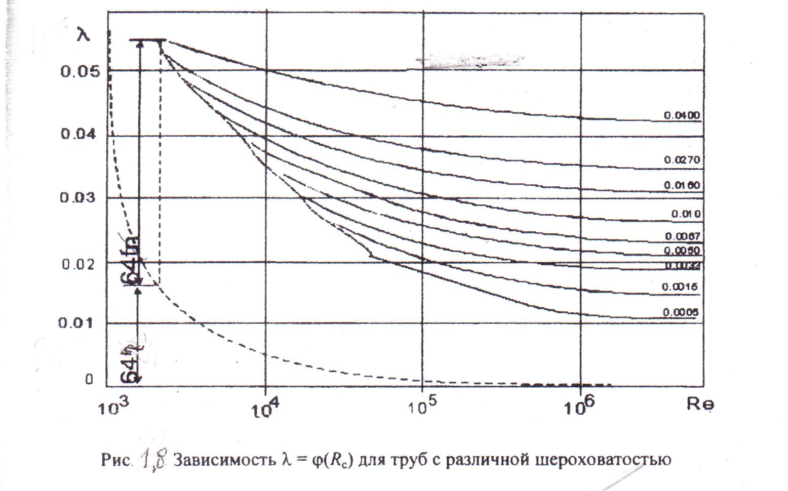 При турбулентном течении в контакте подвижных слоев воды с неподвижными, возникает система вращающих сил. Одна пара – силы взаимодействия воды со стенками трубы и радиальные силы, другая – осевые усилия и силы взаимного трения. Вследствие наличия системы вращающих сил в контакте со стенками труб возникают завихрения воды. Момент перехода от ламинарного к турбулентному режиму определяется скоростью течения, а скорость течения зависит от шерховатости стенок труб. Выступы, ребра, углы и вершины кристаллических зерен твердого тела обладают большим числом ненасыщенных химических связей, большой поверхностной энергией. Все это увеличивает взаимодействие молекул воды со стенками трубы. Вследствие высокой прочности связей контактные слои воды при течении снижают скорость. Внутренние слои в трубе в это время приобретают, вследствие малой величины вязкого трения, значительные скорости. Создается перепад давления(радиальные усилия) уже при относительно невысоких скоростях течения. В гладких трубах выступы отсутствуют, вследствие чего касательные напряжения оказываются незначительными. 1Поскольку даже контактные слои воды перемещаются (υ ≠ 0), то перепад давления понижается и радиальные усилия оказываются незначительными. Значительный перепад давления в этом случае возможен только при скоростях значительно превышающих скорости в шероховатых трубах. Поэтому переход от ламинарного к турбулентному режиму происходит для труб с различной шероховатостью в широком диапазоне скоростей. С целью проверки рассмотренных выводов использовались экспериментальные материалы Г.А. Мурина по исследованию зависимости гидравлических сопротивлений от критерия Рейнольдса в стальных трубах с различной шероховатостью. По данным этих экспериментальных исследований построены графики (рис. 1.8.).