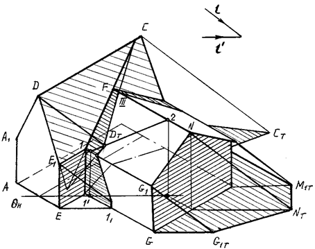 При решении задач на построение теней пересекающихся многогранников не ограничиваются определением контуров собственных теней данных поверхностей и падающих теней от них на плоскости проекций. Задачи завершаются построением падающих теней от неосвещенных граней одного тела на пересекающиеся с ними освещенные грани второго. Каждая линия искомого контура будет представлять собой пересечение лучевой плоскости, проходящей через ребро неосвещенной грани одного многогранника, с освещенной гранью второго. Таким образом, в основе всех построений будет решение задачи об определении тени от прямой на плоскости, где для ее решения используется метод обратных лучей. Такая задача рассматривалась на рис. 86 и 87. На рис. 96, 97 изображены два взаимно пересекающихся многогранника (в ортогональных проекциях и аксонометрии). Прежде всего строим контуры их падающих теней на плоскость Н, по которым определяем собственные тени. Затем нужно установить, имеют ли место случаи, когда неосвещенная грань одного тела пересекает освещенную грань другого. При построении падающей тени от грани DCI'E' левой призмы на грань I'M'NF правой, воспользуемся обратными лучами, которые проведены через точки I' и П'. Метод обратных лучей является весьма удобным, но не единственным при построении тени от многогранника на многогранник. В некоторых случаях рационально использовать точки пересечения ребер с гранями, на которые падает тень от данного ребра. Эти точки не всегда могут быть в пределах контура грани. На рисунке тень от ребра СD левой призмы на грань FNG'1' правой построена с помощью точек D Т и III. Точка D T(D T', D T'') представляет собой падающую тень от вершины D на грань FNG'1'. Тень от ребра DE' на грань FNG'1' построена при помощи точек D T(D T', D T'') и IV (IV, IV ''). Последняя построена в результате пересечения продолженных за пределы своих контуров граней DCI'E' и 1'FNG'.