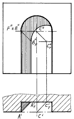 Рис. 100 На участке DEFKA контур собственной тени одновременно является также контуром падающей тени. Начинать построение падающей тени целесообразно с определения условной падающей тени С T'' от центра С полуокружности G. Из полученной точки С T'' описываем дугу окружности в пределах от точки В T'' до точки N T''. В точке В T'' к этой дуге примыкает вертикальная тень В T'' А T'' ребра АВ.