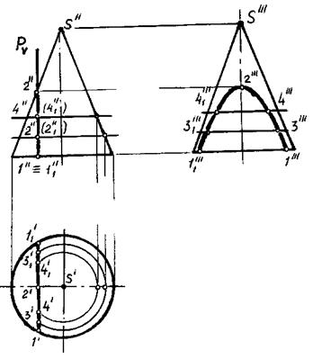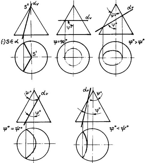 Коническими сечениями называются линии, которые получаются при пересечении поверхности конуса второго порядка с плоскостью. К числу этих линий относятся следующие: окружность, двойная прямая, две пересекающиеся прямые, эллипс, парабола, гипербола. Простейшим коническим сечением является точка. Рассмотрим все виды конических сечений и условия, при которых они получаются, на примере конуса вращения, пересеченного проецирующими плоскостями рис. 141: 1) точка S, когда плоскость a пересекает только вершину конуса (рис. 141а); 2) окружность, когда секущая плоскость перпендикулярна к оси конуса (рис. 141б); 3) двойная прямая, когда секущая плоскость является предельной, т. е. касательной к поверхности конуса (рис. 141в); 4) две пересекающиеся прямые, когда секущая плоскость проходит через вершину (рис.); 5) эллипс, когда плоскость пересекает все образующие конуса и когда она не перпендикулярна его оси (рис. 141а).