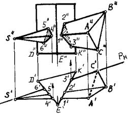 Рис. 152 Как и в предыдущем примере, грани одной призмы являются проецирующими поверхностями. По известным горизонтальным проекциям 1', 2', 3', 4',... точек линии пересечения находят их фронтальные проекции. Ребро А не участвует в пересечении. Ребро Е пересекает грани АС и АВ в точках 5' и 6'. Чтобы найти эти точки, проводят через ребро Е горизонтально-проецирующую плоскость Р, которая пересечет грани АС и АВ по прямым линиям ММ 1 и NN 1. Пересечение этих прямых с ребром Е определяет точки 5 и 6. Найденные точки последовательно соединяют прямыми, в результате получают замкнутую ломаную линию пересечения заданных многогранников.