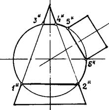 Этот способ применяется в случае, когда оси двух поверхностей вращения пересекаются под некоторым углом и находятся в плоскости, параллельной какой-либо плоскости проекций (особенно в том случае, когда на чертеже дана только одна проекция деталей). Шар со всякой поверхностью вращения, ось которой проходит через центр шара, пересекается по окружностям. Эти окружности находятся в плоскостях, перпендикулярных к оси поверхности вращения, и проецируются на одну из плоскостей проекций в виде прямых, в этом состоит преимущество способа сфер. На рис. 155 дана фронтальная проекция шара, пересекающегося с конусом и цилиндром. Как видно, центр шара находится на пересечении осей данных поверхностей, а линии его пересечения с ними — окружности диаметров: 1-2, 3-4, 5-6.