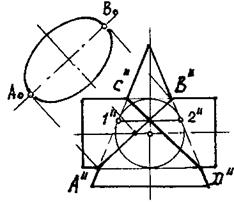 2. Две пересекающиеся поверхности касаются третьей поверхности второго порядка. Т еорема (теорема Г.Монжа). Если две пересекающиеся поверхности второго порядка могут быть описаны вокруг третьей поверхности второго порядка или вписаны в нее, то они пересекаются по двум плоским кривым второго порядка. Теорема Монжа — частный случай теоремы о двойном соприкосновении. Например, поверхности конуса и цилиндра с общей фронтальной плоскостью симметрии касаются сферы по окружностям 1”-2”и 3”-4”. Линия пересечения поверхностей представляет собой два эллипса, плоскости которых перпендикулярны фронтальной плоскости проекций(рис. 160).