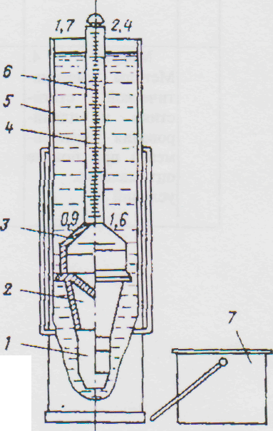 Для измерения плотности могут быть использованы также рычажные весы - плотномер ВРП-1 (рис 1.19). Плотномер состоит из стойки и рычага со стаканом. На рычаге имеются две призмы с помощью которых рычаг устанавливают на стойке, и две шкалы, соответствующие этим призмам. Для определения плотности стакан заполняют раствором до отверстия и закрывают крышкой, рычаг устанавливают на правую призму, с помощью подвижного груза стакан с раствором уравновешивают и показания снимают по нижней шкале.Для более точного измерения плотности раствора используют пикнометр представляющий собой стеклянный сосуд с притертой пробкой. ………………………… Для определения плотности раствора вначале взевшивают пой пикнометр Плотность бурового раствора рассчитывают по формуле