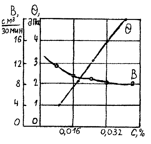 На рис. 3.4 показана зависимость прочности структуры и водоотдачи от концентрации ГПАА. Из графика видно, что даже при малых концентрациях полимера наблюдается значительное повышение прочности структуры раствора. Такие полимеры способны адсорбироваться только под воздействием сильного силового поля (стенок скважин, стенок бурильных труб).