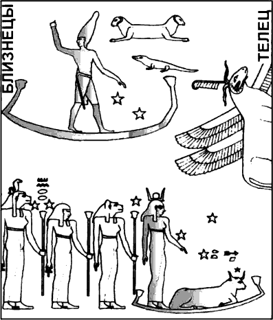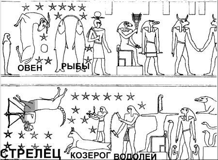 Расскажем теперь, пока в общих словах, – к каким именно выводам относительно астрономического содержания египетских зодиаков мы пришли. Конкретные таблицы астрономической символики египетских зодиаков с указанием астрономического значения каждого символа будут приведены ниже. Начнем с замечания, что во многих случаях на разных египетских зодиаках встречаются одни и те же или очень похожие друг на друга символы. Иногда символы повторяются точно, иногда с небольшими изменениями. Более того, повторяются не только отдельные символы, но и целые их группы. Если приглядеться внимательнее, то оказывается, что некоторые такие группы повторяющихся символов, а также некоторые отдельные символы, всегда находятся в одном и том же месте эклиптики. То есть всегда расположены в одних и тех же созвездиях на всех египетских зодиаках. Конечно, это не относится к планетным символам. Напомним, что планеты постоянно меняют свое место на эклиптике, переходя из одного зодиакального созвездия в другое. Поэтому очевидно, что в данном случае мы имеем дело с какой-то другой, не планетной символикой. Но, по всей видимости, – тоже астрономической, поскольку она «привязана» к определенному месту среди звезд. Это замечание приводит к важным следствиям, которые позволят нам более полно разобраться в символике египетских зодиаков. В том числе – и в их планетной символике.
