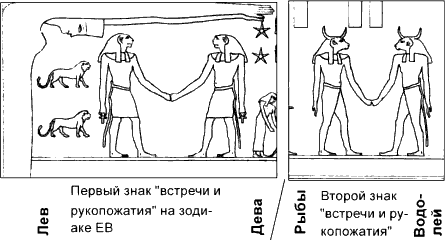 Вернемся к Близнецам на египетских зодиаках. Мы видели, что созвездие Близнецов содержит в себе точку летнего солнцестояния. Эта точка, очевидно, и изображена на египетских зодиаках в Близнецах с помощью указанной выше группы символов. Причем – совершенно четко и недвусмысленно. Еще один пример. На зодиаке EB из большого эснского храма, в числе других символов можно заметить два практически одинаковых знака. Каждый из них представляет собой пару человеческих фигур с лицами животных, стоящих напротив и пожимающих друг другу руки. Как будто изображается какая-то встреча, Рис.3.16. Что это может означать? Чтобы разобраться в этом, посмотрим – где именно нарисованы эти два парных «знака встречи» или «знака рукопожатия» на зодиаке EB. Оказывается, что один из них расположен между знаками Девы и Льва, а другой – между Рыбами и Водолеем. Но это означает, что они помещены в противоположные точки эклиптики. Напомним, что созвездия Девы и Рыб расположены в точности друг против друга на небе. Так что же «встречается» и «пожимает друг другу руки», в этих точках? Ответ прост и очевиден. Именно здесь, в созвездиях Девы и Рыб находятся точки весеннего и осеннего равноденствия. Когда через них проходит Солнце, двигаясь среди звезд по своему годовому пути, день становится равным ночи. В эти дни день и ночь «встречаются», сравниваются. А потом снова «расходятся», то есть становятся разными по продолжительности. Такая «встреча» дня и ночи бывает ровно два раза в году. Один раз – весной, в день весеннего равноденствия, когда Солнце находится в созвездии Рыб (речь идет о последних двух тысячелетиях). На эснском зодиаке EB это событие отмечено знаком «встречи и рукопожатия». Второй раз они «встречаются» осенью, когда Солнце проходит точку осеннего равноденствия в Деве. Что отмечено на зодиаке EB еще одним знаком «встречи и рукопожатия». В перечисленном выше порядке точки равноденствия появляются в привычном нам январском году. Или в мартовском. В египетских же зодиаках год начинался с сентября, поэтому на них, наоборот, – осеннее равноденствие является первым, а весеннее – вторым.