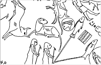 1) «Шест (с птицей)», Рис.3.8, Рис.3.9. В отдельных случаях шест может изображаться и без птицы, а по бокам от него – два изогнутых и склоненных шеста такой же формы, Рис.3.10. 2) «Человек с высоко поднятой рукой», Рис.3.9, Рис.3.11, Рис.3.12. Если в другой руке у человека – планетный посох, то он обязательно будет изображен стоящим в ладье, Рис.3.9. 3) «Лежащий телец (и женщина)», Рис.3.8, Рис.3.9, Рис.3.11, Рис.3.12. За лежащим тельцом часто, но не всегда изображена женщина, Рис.3.8, Рис.3.9, Рис.3.11, Рис.3.12. Иногда она стреляет в тельца из лука, Рис.3.8. На некоторых зодиаках телец и женщина нарисованы плывущими в ладьях, Рис.3.9, Рис.3.12. Иногда – оба в одной и той же ладье, иногда – в разных. На Круглом дендерском зодиаке в ладье плывет только телец, а женщина изображена без ладьи, Рис.3.8.