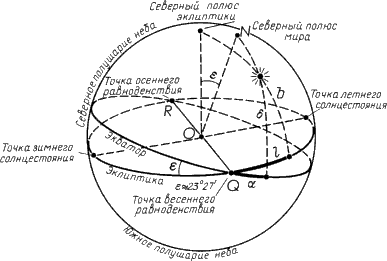 Итак, годовой путь Солнца, Луны и планет среди звезд проходит вдоль одной и той же окружности на небесной сфере, которая в астрономии называется эклиптикой. Звезды, расположенные вблизи эклиптики, образуют зодиакальные созвездия. Получается замкнутый пояс созвездий, охватывающий небесный свод и как бы нанизанный на эклиптику. Если говорить точнее, то эклиптикой называется окружность пересечения плоскости вращения Земли вокруг Солнца с воображаемой сферой неподвижных звезд. За центр этой сферы можно принять центр Солнца, лежащий в плоскости эклиптики. Рис.5.3 это точка O. Впрочем, как мы уже говорили, по отношению к далеким звездам движением Земли, а также расстоянием от Земли до Солнца, можно пренебречь и считать Землю неподвижным центром небесной сферы.