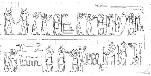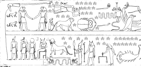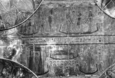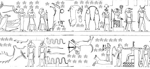 Рис.6.59 Фрагмент потолка Большого эснского храма. Внизу видна сцена смерти и воскресения Осириса в 14-ую Луну – такая же, как и на Малом эснском зодиаке. Ср. Рис. 4.71. Это – символическое изображение астрономических условий христианской Пасхи.