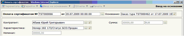 Рисунок 4 1 (Рисунок 4)– в поле «Характеристика» с помощью кнопки 2 (Рисунок 4)– в поле «Номинал» автоматически проставляется номинал сертификата. 3 (Рисунок 4)– в поле «Сумма» автоматически проставляется равная номиналу сертификата сумма, на которую будет засчитана оплата. Изменение невозможно. 4 (Рисунок 4)– в поле валюты автоматически проставляется валюта расчета – «RUB». После заполнения всех полей «Оплата сертификатом» необходимо нажать кнопку После первой оплаты тура при сохранении операции оплаты сертификатом автоматически сформируется договор с клиентом. ВАЖНО На сумму разницы между номинальной стоимостью сертификата и стоимостью тура турист производит доплату любым удобным для него способом (наличный, безналичный, кредитные карты). Задолженность клиента уменьшается на сумму номинала предъявленного к оплате сертификата. Если стоимость тура ниже номинала сертификата, предъявленного туристом, разница не выплачивается ни в каком виде и не переносится на оплату другого договора.