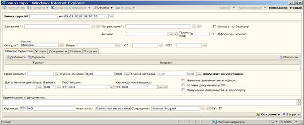 Находясь в журнале «Заказы», для создания нового заказа (тура) нажимаем кнопку