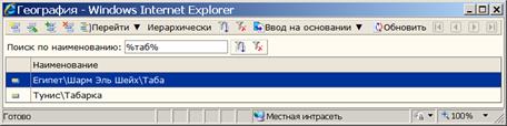 Рисунок 24 Если отель, в который будет оформляться размещение, находится, например, в Табе, то в поле «Куда» необходимо указывать сразу «Таба», а не «Египет». Набрав в окне «Поиск по наименованию» «% часть названия» искомого элемента географии и нажав кнопку Поиск следует осуществлять только через поисковое окно, так как поиск вручную позволит занести в поля «Откуда» и «Куда» (Рисунок 25) только конечные элементы справочника «География» (населенный пункт) и не позволит занести страну или область.
