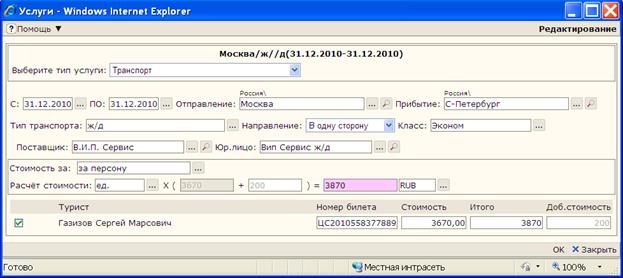 Рисунок 38 8 (Рисунок 37) - при определении типа стоимости «за персону» вносите сумму стоимости билетов в поле (8) ВНИМАНИЕ!!! - ПРИ БРОНИРОВАНИИ БИЛЕТОВ У ПОСТАВЩИКА ВИП СЕРВИС НЕОБХОДИМО СТОИМОСТЬ УКАЗАННУЮ НА САЙТЕ «ВИП Сервиса» СТАВИТЬ В ПОЗИЦИЮ «8» (Рисунок 37). - Эта же сумма является себестоимостью по этим билетам! - К этой сумме автоматически прибавляется 4%, которые являются нашей комиссией. 9 (Рисунок 37) – общая сумма стоимости билетов для клиента. ВНИМАНИЕ!!! При необходимости общую стоимость билетов можно изменить ТОЛЬКО в БОЛЬШУЮ сторону! 10 (Рисунок 37) – в поле «Номер билета» в обязательном порядке необходимо внести номер бланка билета на каждую персону. ВНИМАНИЕ!!! После внесения Номера билета и сохранения заказа, Заявка Поставщику сформируется автоматически (Рисунок 37а) 4.5.4.2. Тип услуги – Транспорт от поставщика ВИП Сервис ж/д Тип услуги - «Транспорт/ ж/д» от поставщика ВИП Сервис представлен на (Рисунок 38).